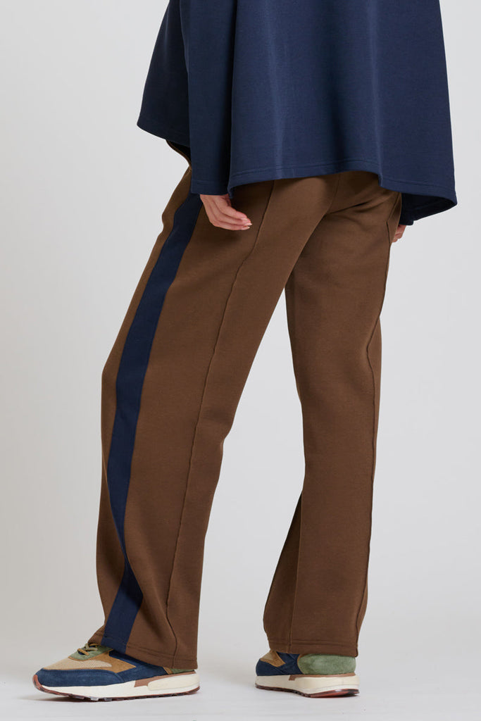 Introducing our NEW SCUBA track pant, an elegant and elevated interpretation of the classic 70s sport style. Featuring a mid- rise fully elasticised waist, side pockets & flattering wide leg styling finished with centre seams and racing stripe at sides. Gorgeous on trend rich chocolate color for Winter.