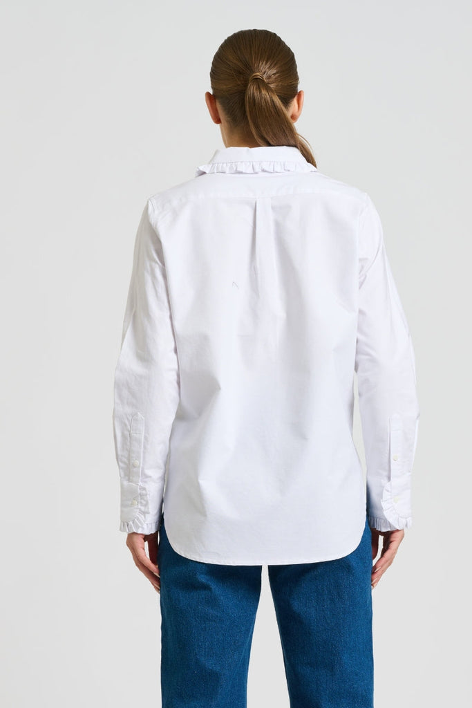 Babette and femine and pretty as she sounds. 100% cotton oxford, gorgeous peter pan collar with ellegant frill detailing on collar & cuff. Classic tailored fit.